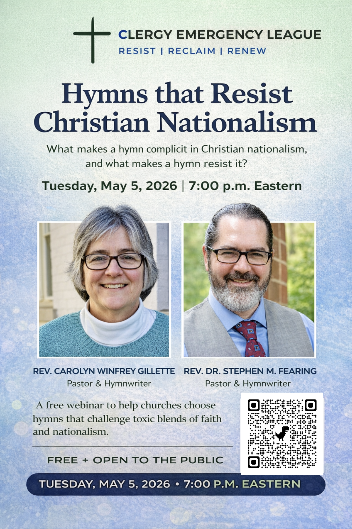 Upcoming WebinarlJoin the Clergy Emergency League on Tuesday, May 5 at 7:00 p.m. Eastern for a timely Zoom webinar on hymns that resist Christian nationalism, featuring Rev. Dr. Stephen M. Fearing in conversation with renowned hymn writer Carolyn Winfrey Gillette. As churches prepare for the 250th anniversary of the Declaration of Independence and the wave of national celebrations this July, this conversation will explore how congregational song can either reinforce toxic blends of faith and nationalism or bear more faithful witness to the Gospel of Jesus Christ, asking the central question: “What makes a hymn complicit in Christian nationalism, and what makes a hymn resist it?” Together, Stephen and Carolyn will highlight hymns that resist Christian nationalism both directly and indirectly, while offering practical guidance for pastors, church musicians, and worship leaders seeking to choose and introduce such hymns thoughtfully in their congregations. The webinar will also reflect on how hymn texts can emphasize humility, justice, peace, hospitality, and our primary identity in Christ over against the claims of civil religion. This free public event will take place via Zoom, and while donations to the Clergy Emergency League are gratefully welcomed to support its ministry and provide honoraria for featured guests, all are invited to join this rich, timely, and urgently needed conversation.